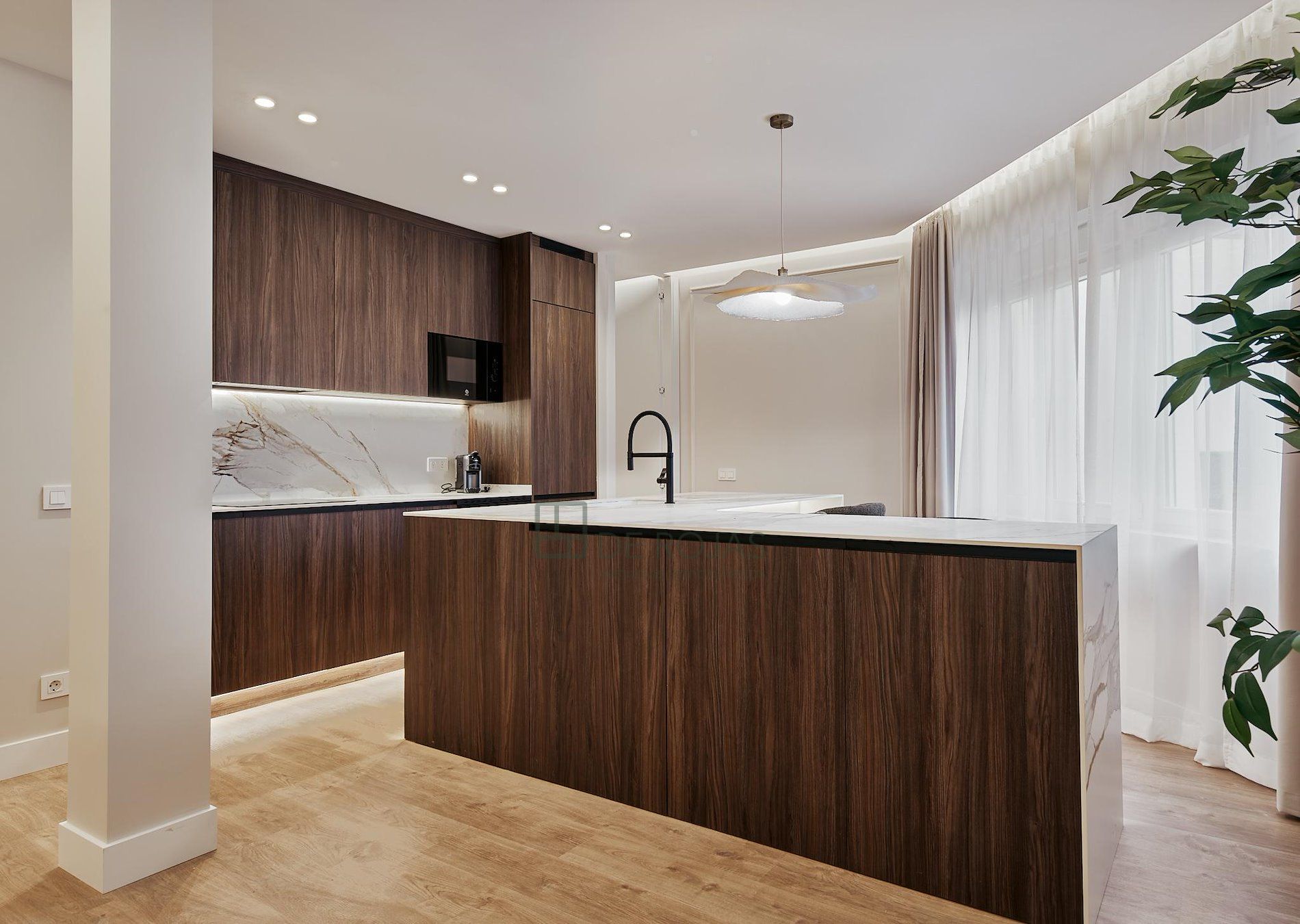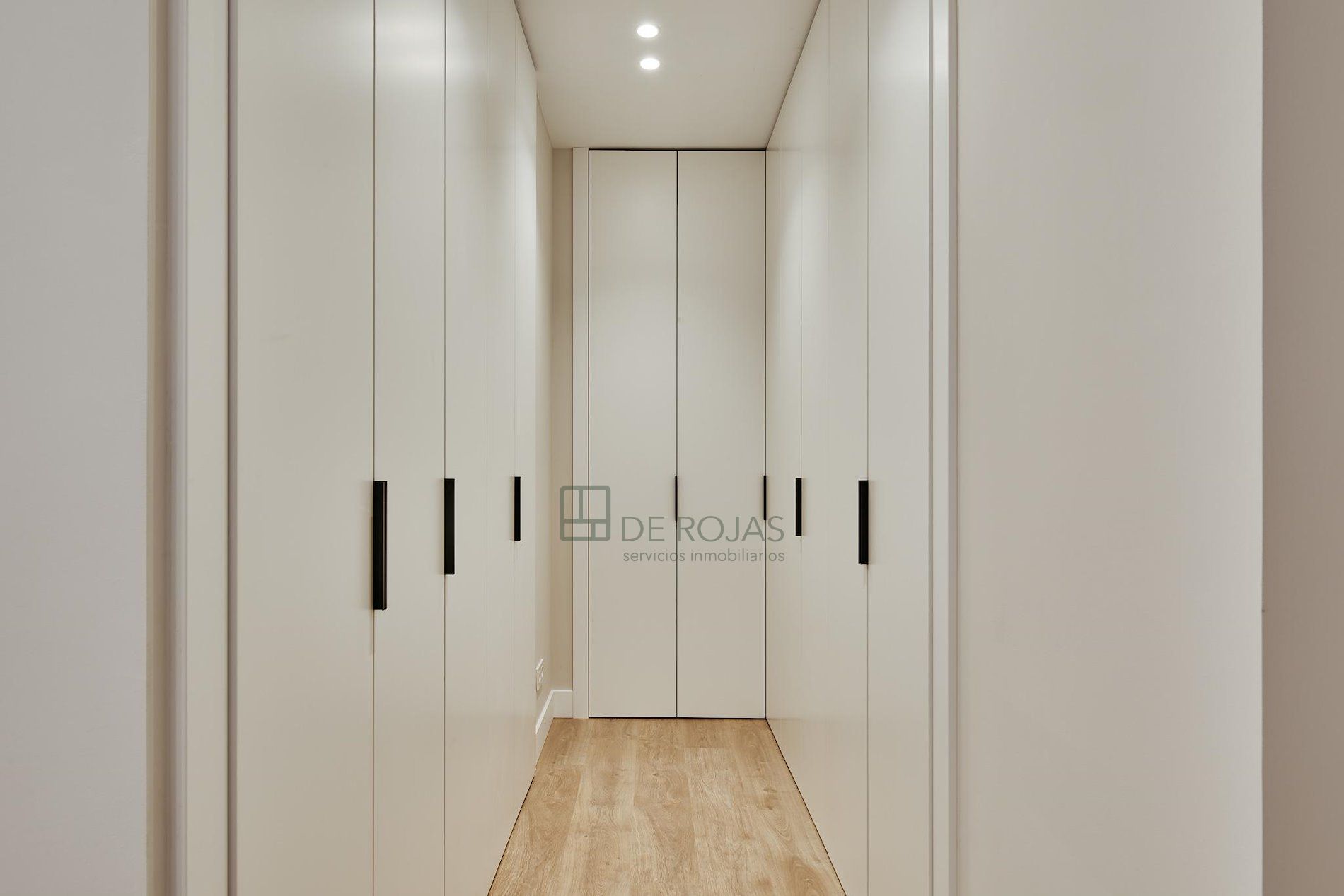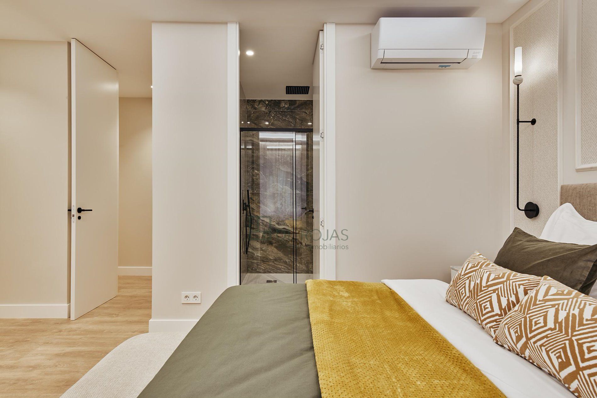 El suelo de tarima en todo el piso aporta un toque cálido y acogedor, complementando perfectamente la decoración del hogar. Además, el piso está equipado con aire acondicionado y ventanas de aluminio lacado, asegurando un ambiente fresco y aislado acústicamente.