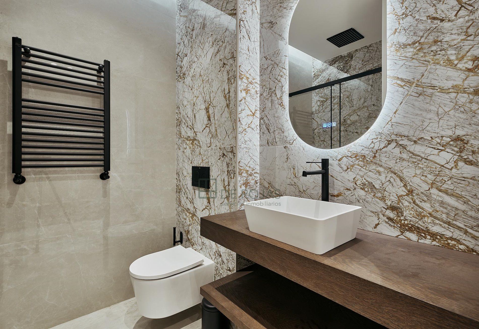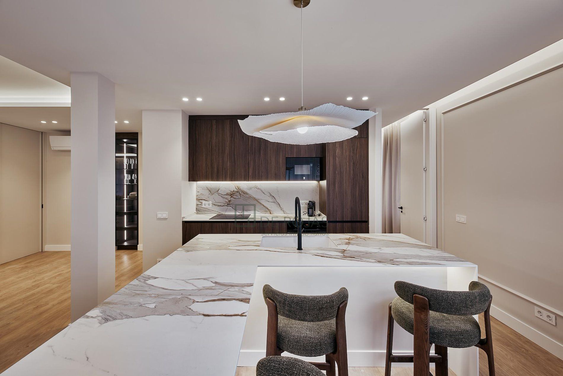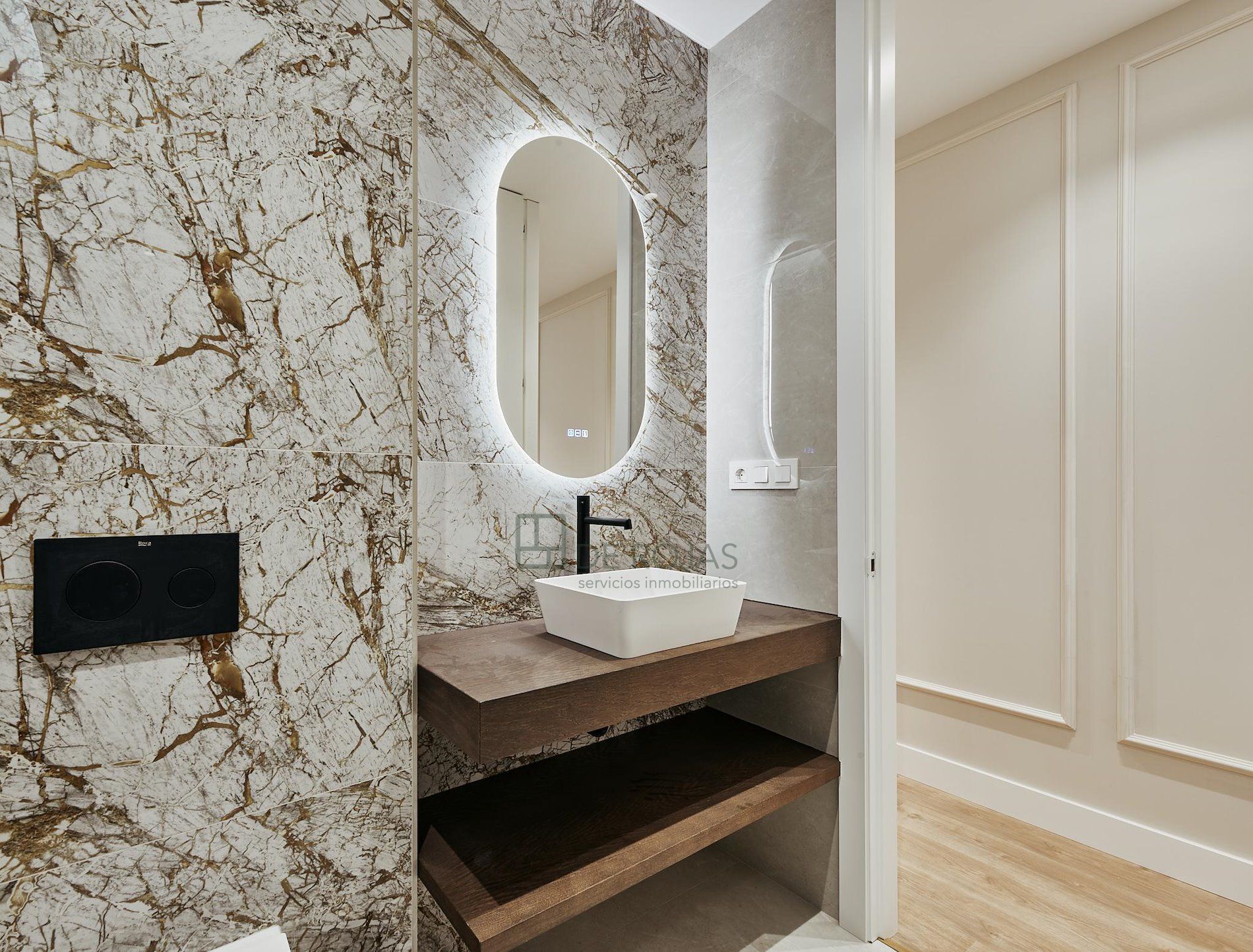 El suelo de tarima en todo el piso aporta un toque cálido y acogedor, complementando perfectamente la decoración del hogar. Además, el piso está equipado con aire acondicionado y ventanas de aluminio lacado, asegurando un ambiente fresco y aislado acústicamente.